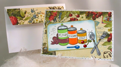 I have used TWO of their digi images and what fun I had creating this card!! I have used Webster's Pages designer paper for my base with faux stitching around the edge. Coloring was done with Prismacolor markers and Crystal Effects was used to add dimension to the lids and silverware.