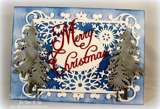I have used Frantic Stamper 'Merry Christmas' FRA-DIE09619 die cut from red cardstock as my sentiment but I see at the time of this posting it is Out of Stock. May I recommend Frantic Stamper 'Happy Holidays' FRA9620 as a substitute. Or any of the various company sentiment dies available at the Dies R Us Store.