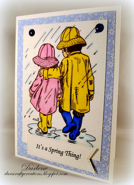 What an adorable image! Pure sweetness! I love to walk in a warm spring rain. Wish we had some warmth to go with our sunshine. This is so pretty, Darlene. Relative simplicity with the pretty paper and sentiment. Good to use some of that old stuff, which most of mine is, but, hey, most of us have more than we can use in a lifetime, right? Hugs and happy day!